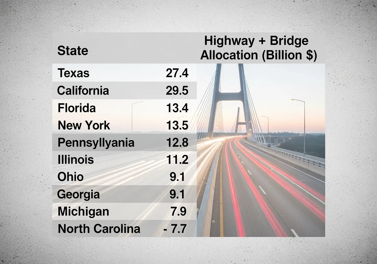 Funding flows everywhere, but heavier traffic corridors and states with the most bridge repair needs are getting major resources first. Here’s a snapshot of top states by federal highway and bridge allocations under the IIJA (source: FHWA, IIJA State Apportionments 2022–2026):