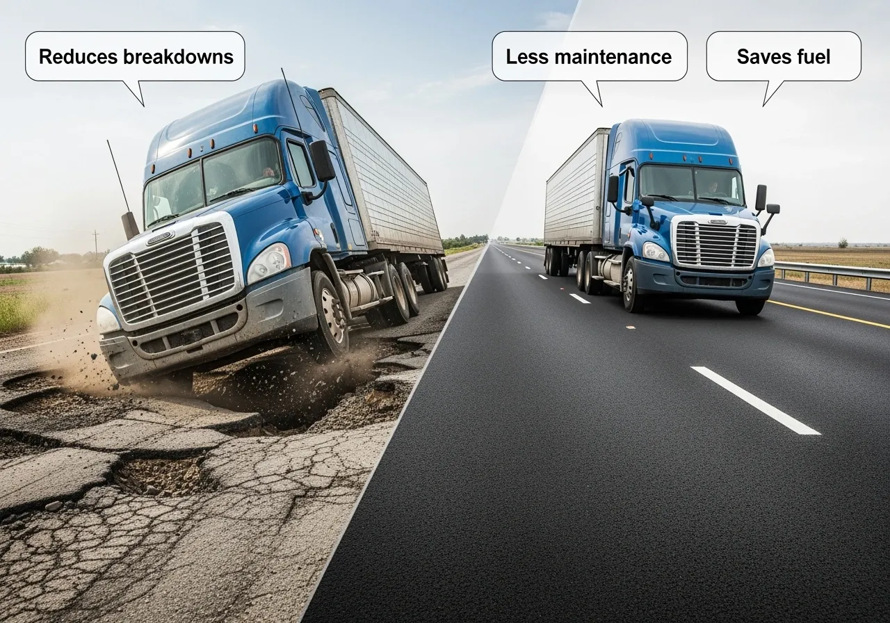 - Smoother pavement reduces wear-and-tear on suspensions, tires, brakes, and cargo.