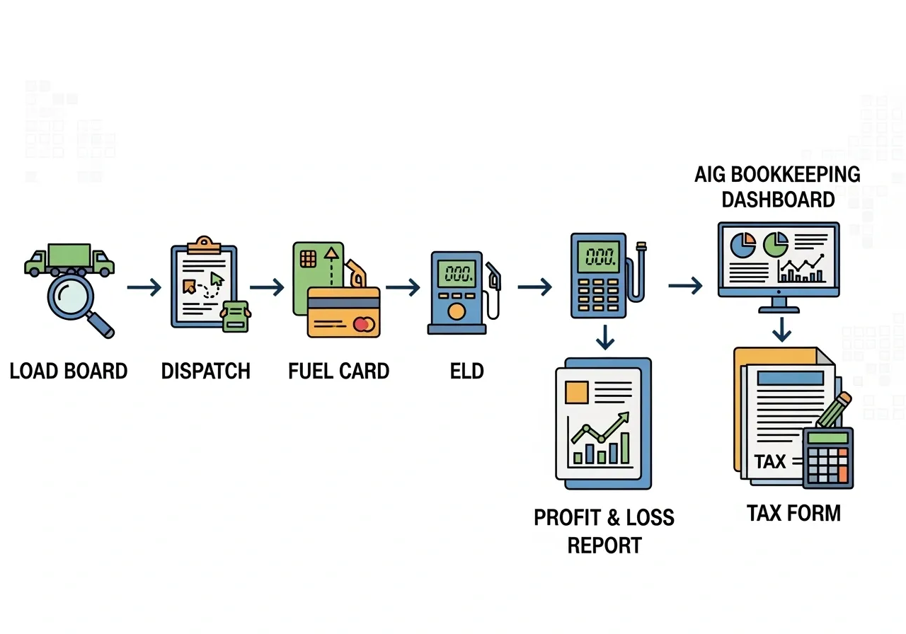 Most trucking operations run on a patchwork of different systems. You’ve got your ELD tracking hours and routes. Your fuel card manages purchases at the pump. Load boards help you find freight. Dispatch software coordinates pickups and deliveries. Each system serves its purpose perfectly – but they don’t talk to each other, and more importantly, they don’t talk to your books.